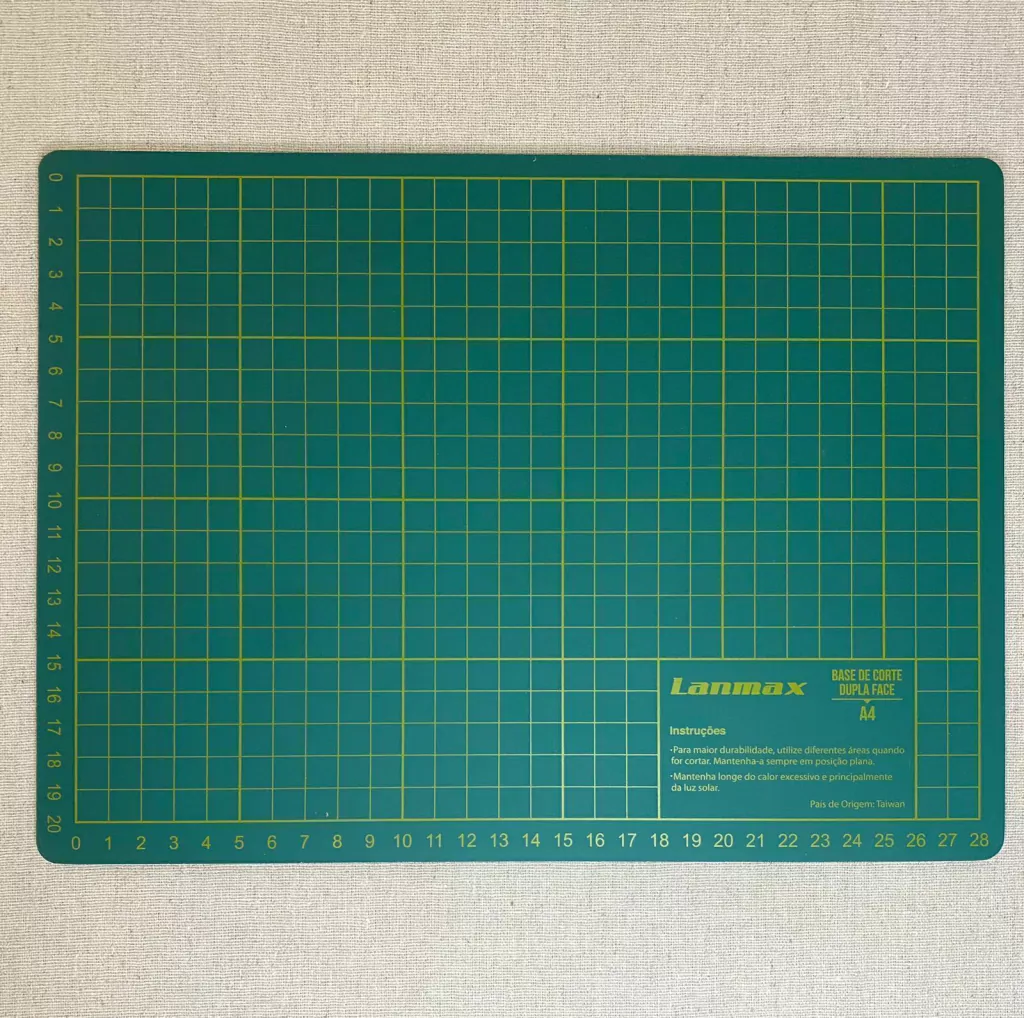 A base de corte, como o próprio nome sugere, é uma manta que fica entre a mesa e o material a ser cortado, possui medidas na frente e no verso que auxiliam na hora dos cortes, podem ser em centímetros ou polegadas.